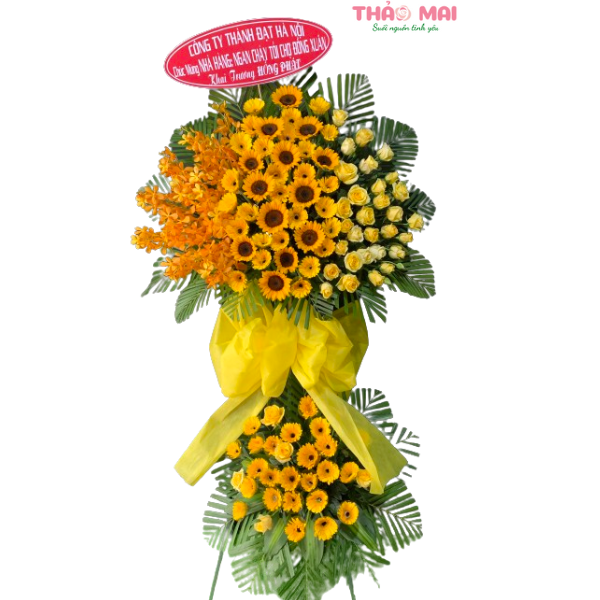 💰Kệ hoa Khai trương Tri ân là sự kết hợp độc đáo giữa hoa hồng vàng, đồng tiền vàng tinh tế sắc sảo và hướng dương may mắn cùng lan vàng sang trọng, trang nhã